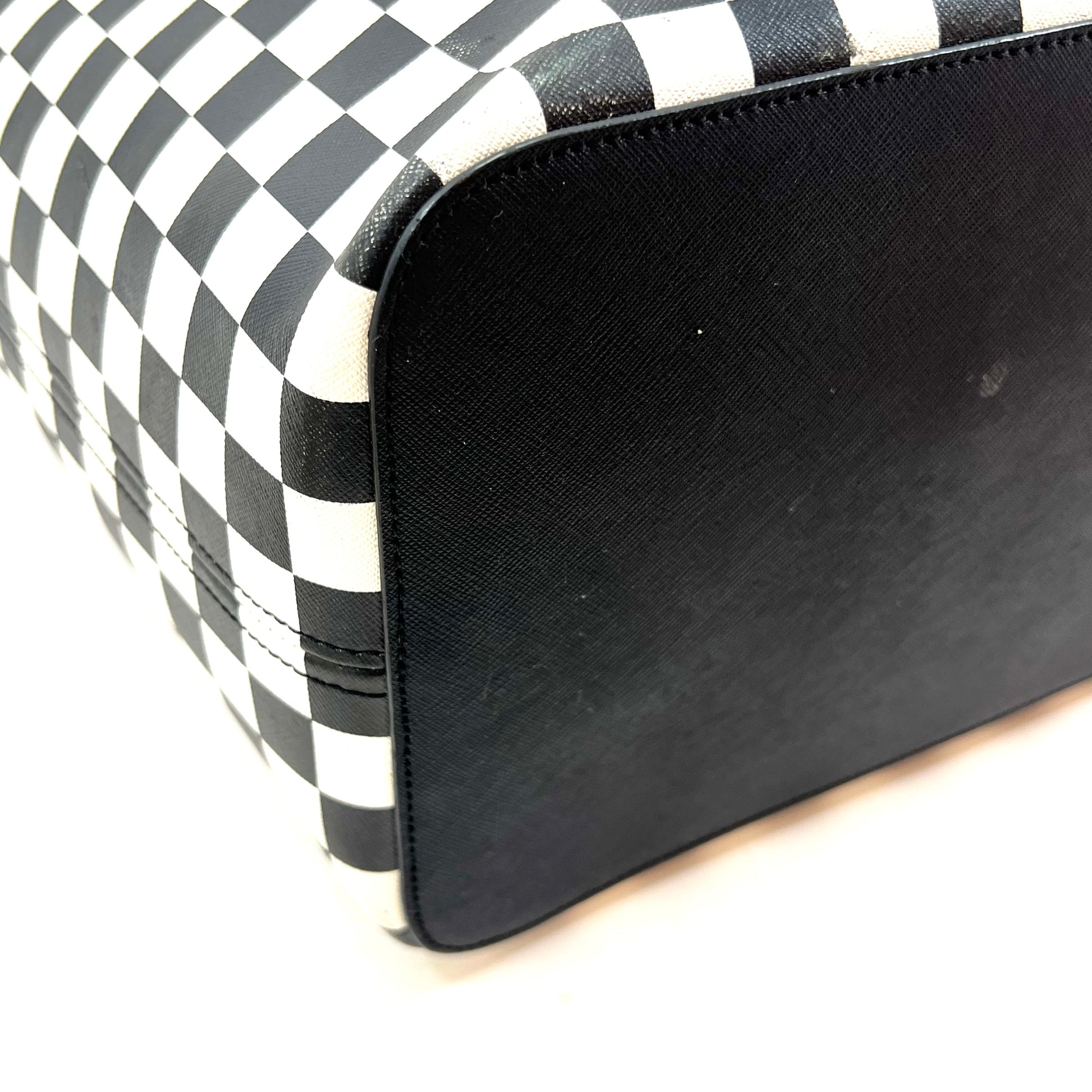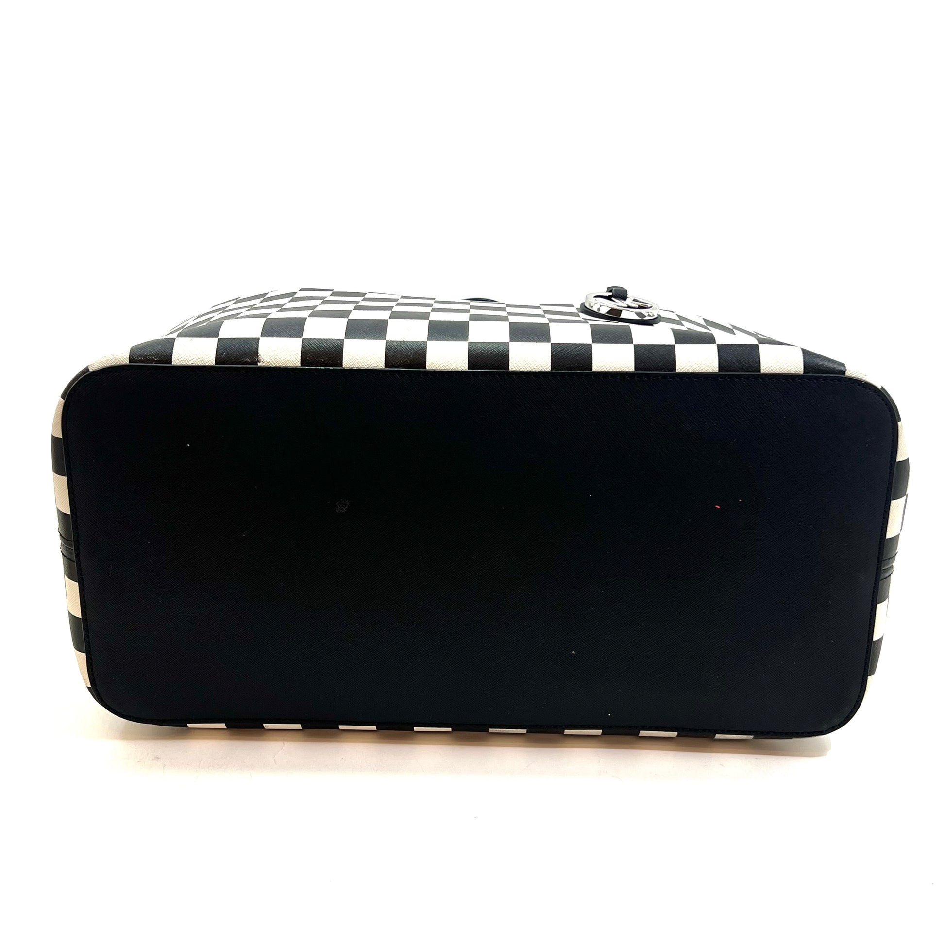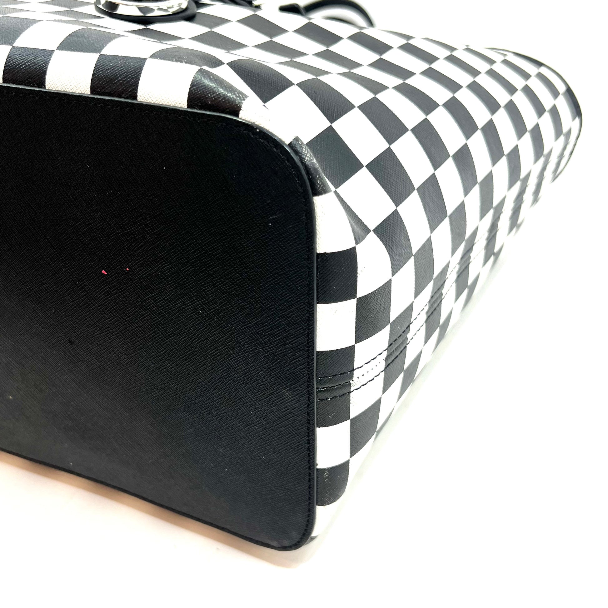 Descripción: Bolso tipo Tote en PVC con diseño de cuadros en blanco y negro con tag del logo de la marca