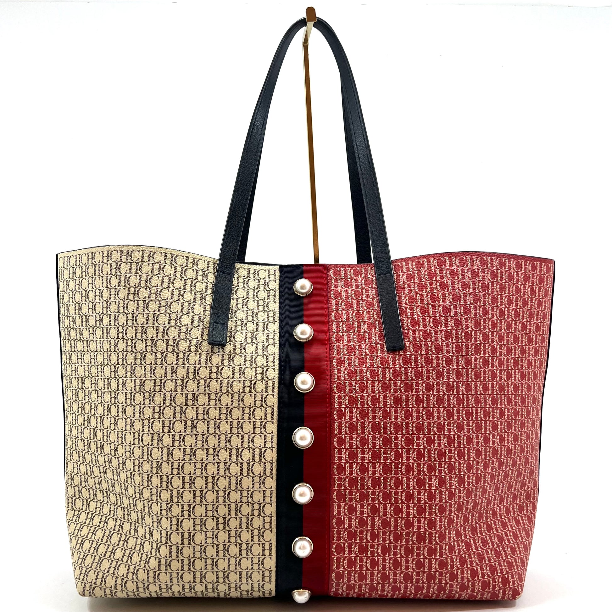 Descripción: Bolso tote Shopping Monogram azul y rojo, con detalles de perlas