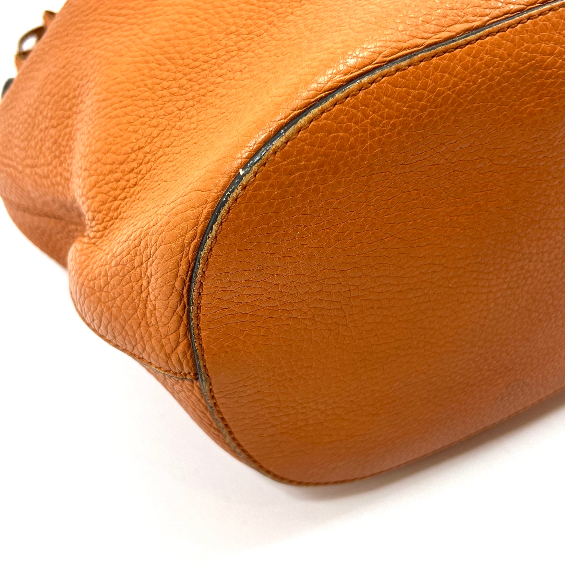Descripción: Bolso lady tipo bucket en piel color naranja, con borlas de bambú