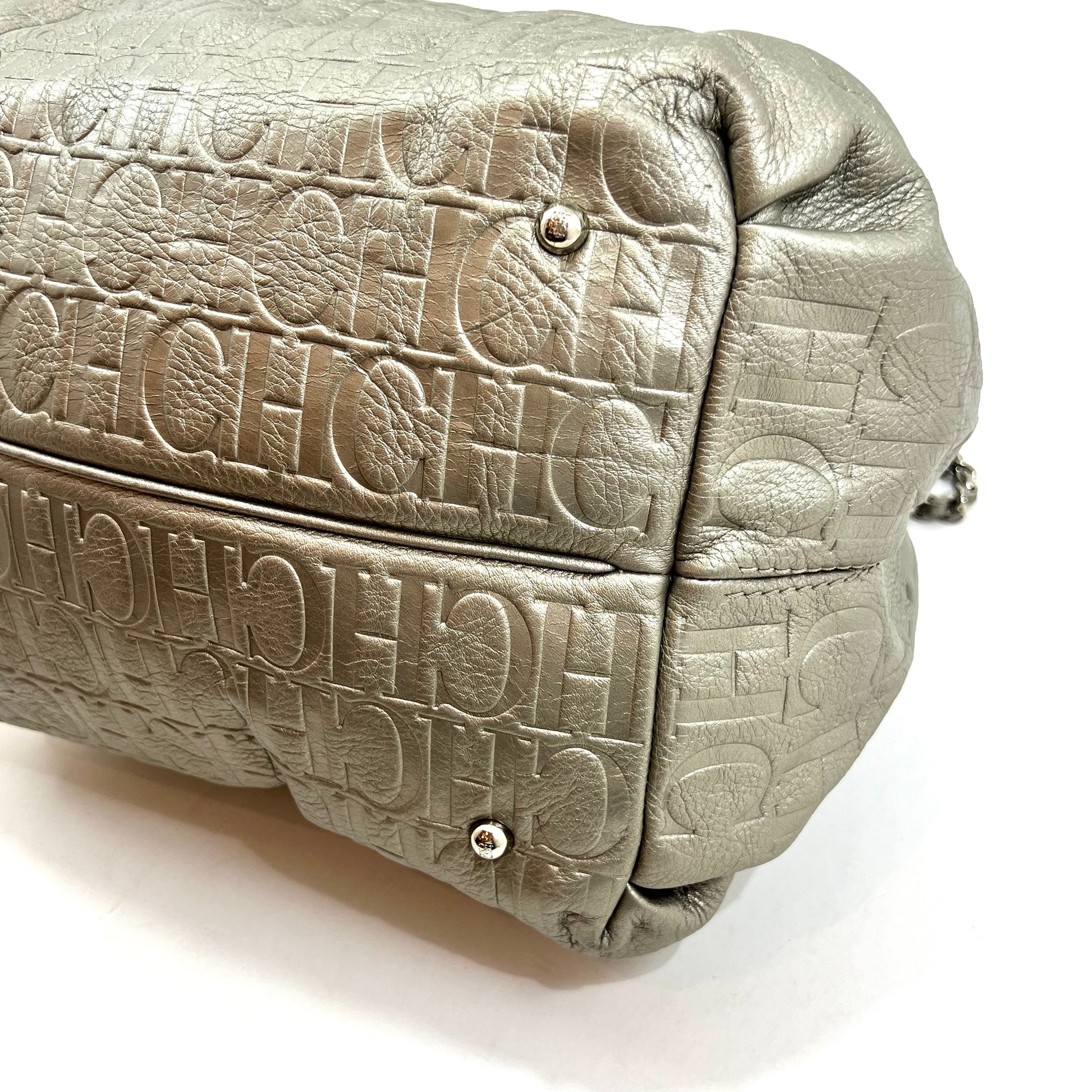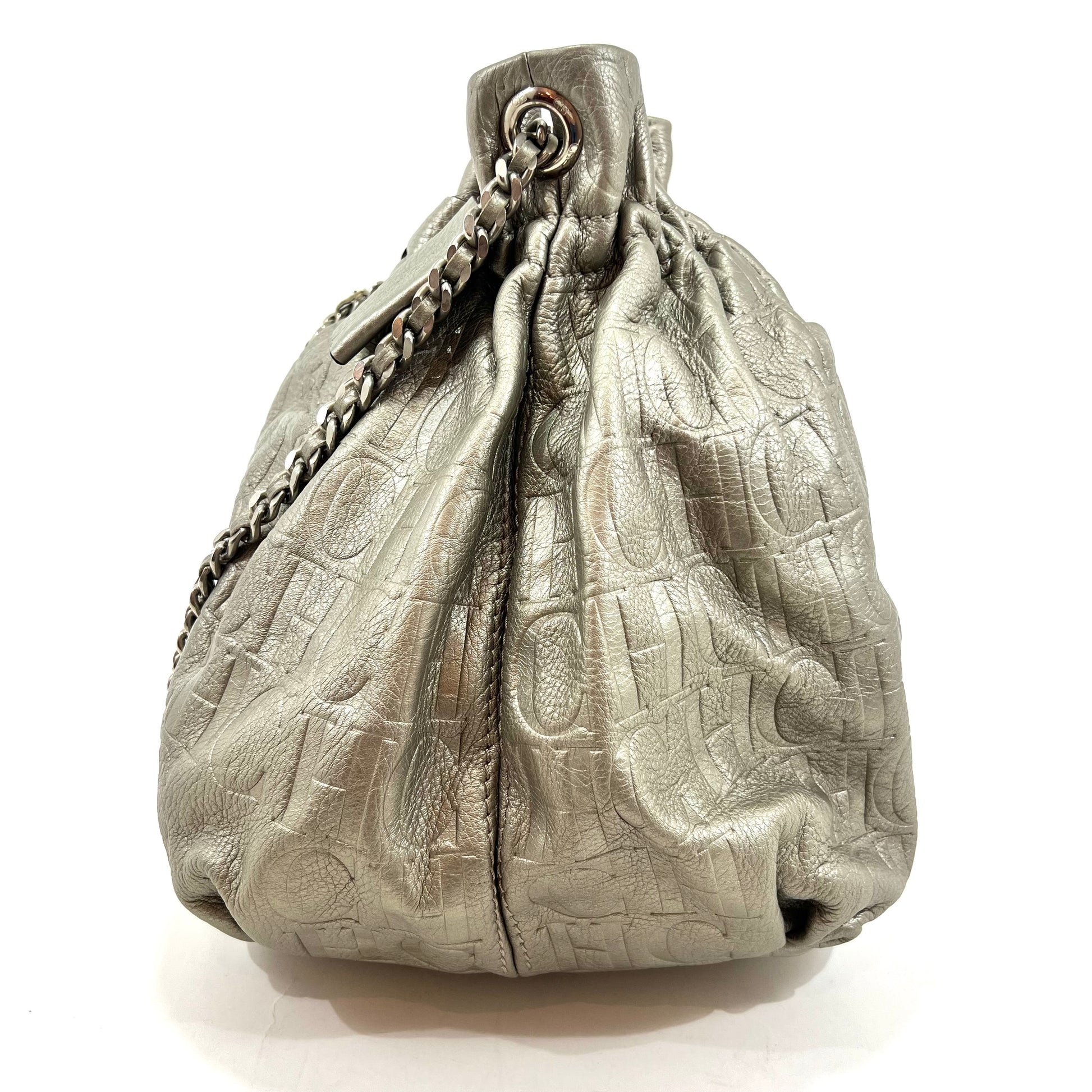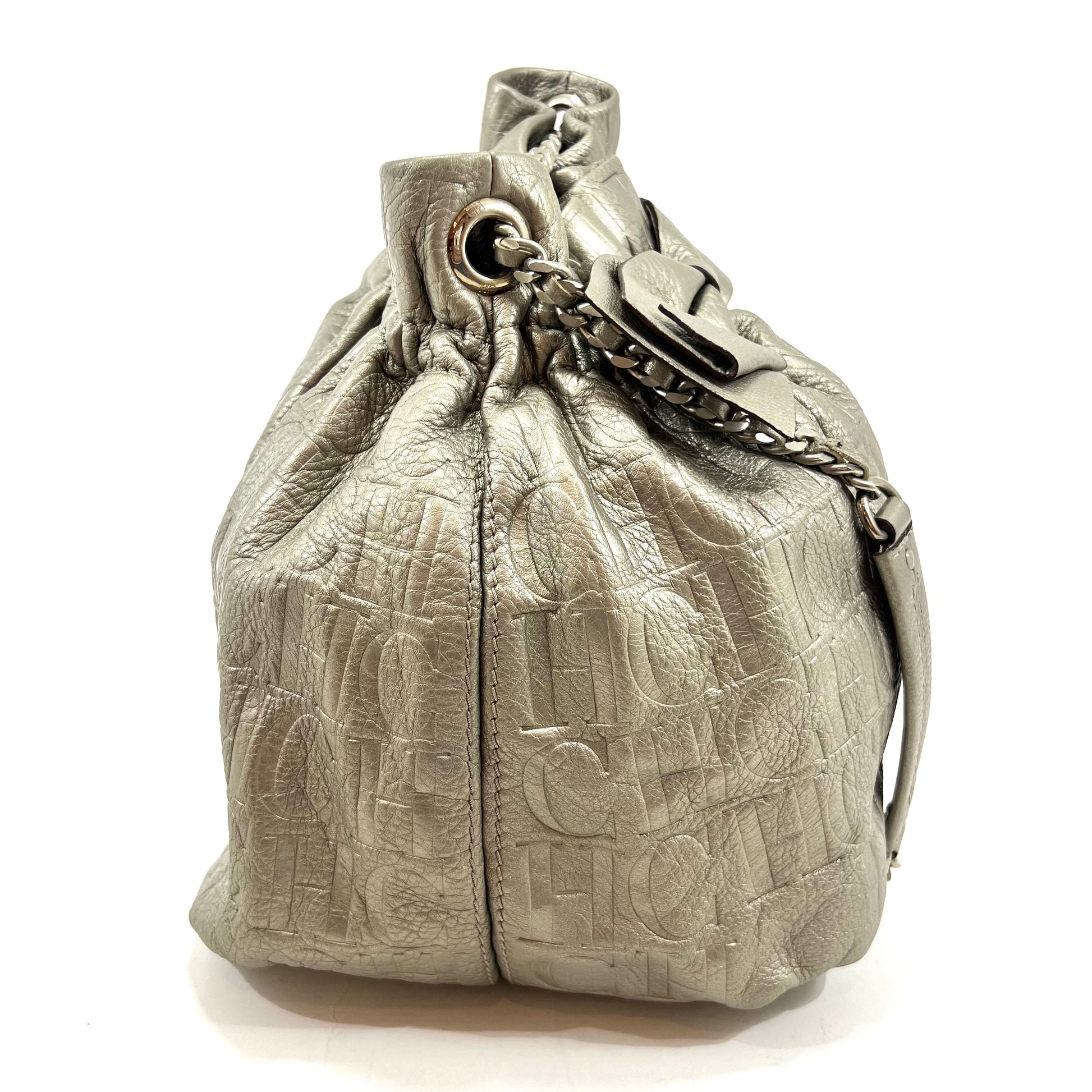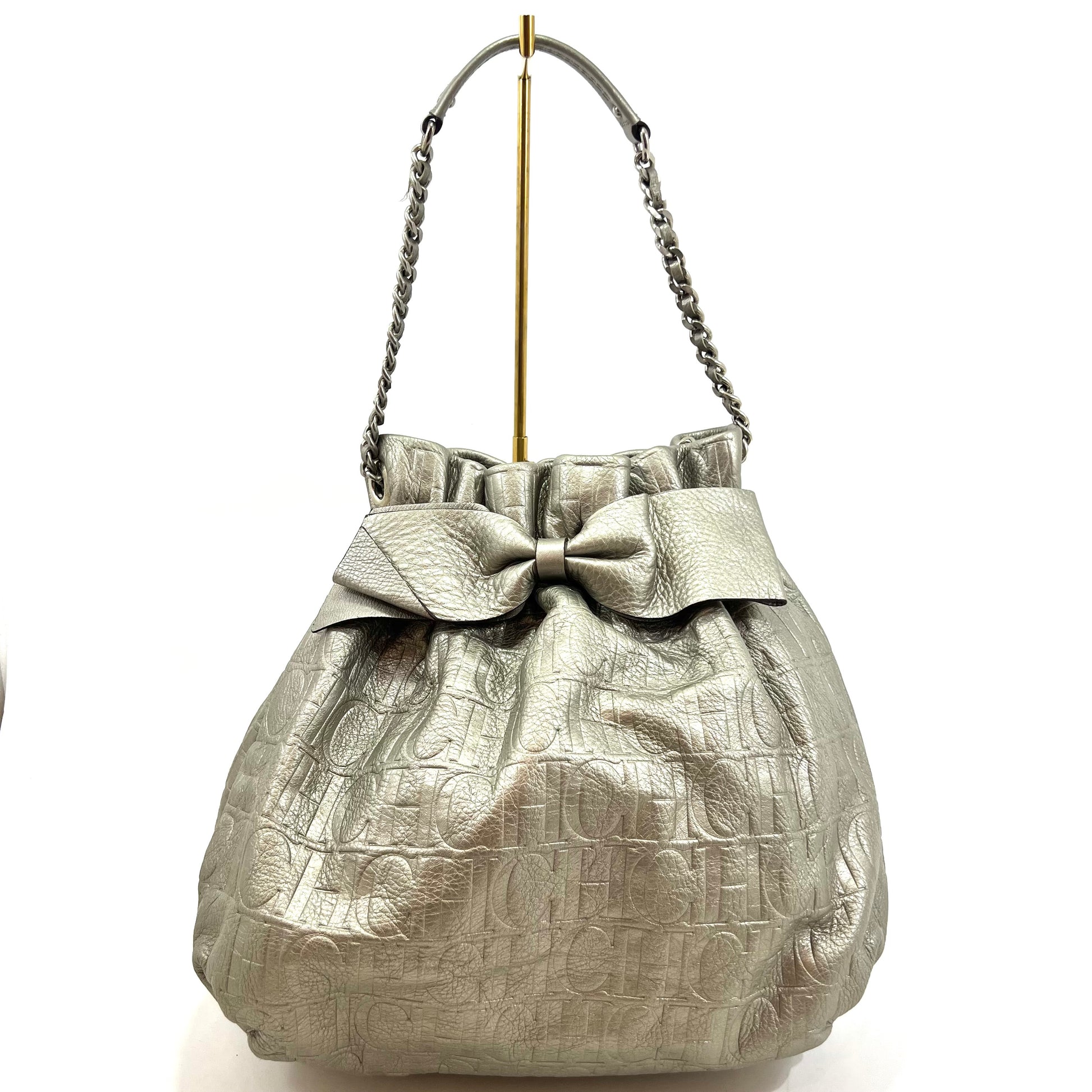 Descripción: Bolso tipo bombonera en piel en color plateado, con el monograma tatuado de iniciales de la marca con moño y cadena