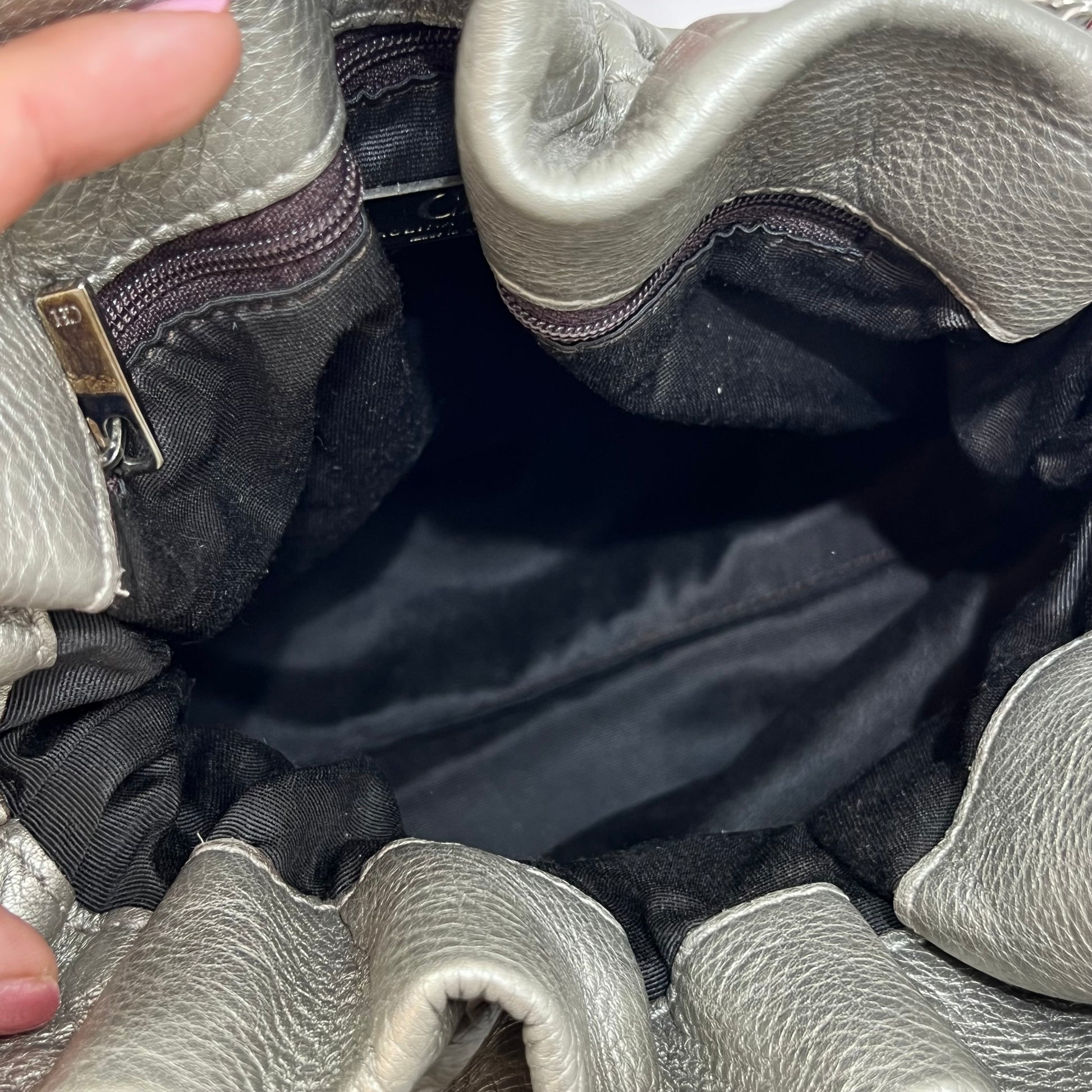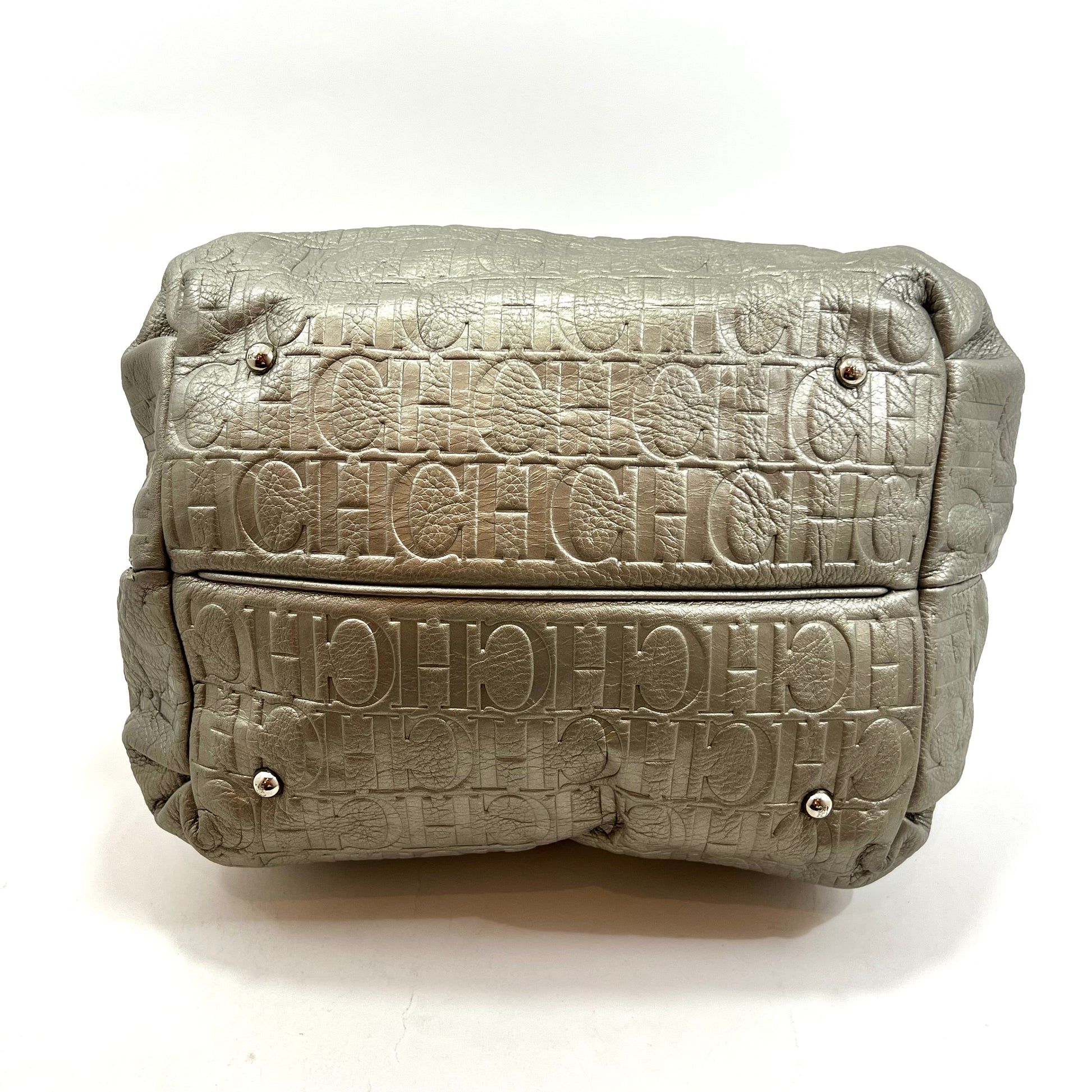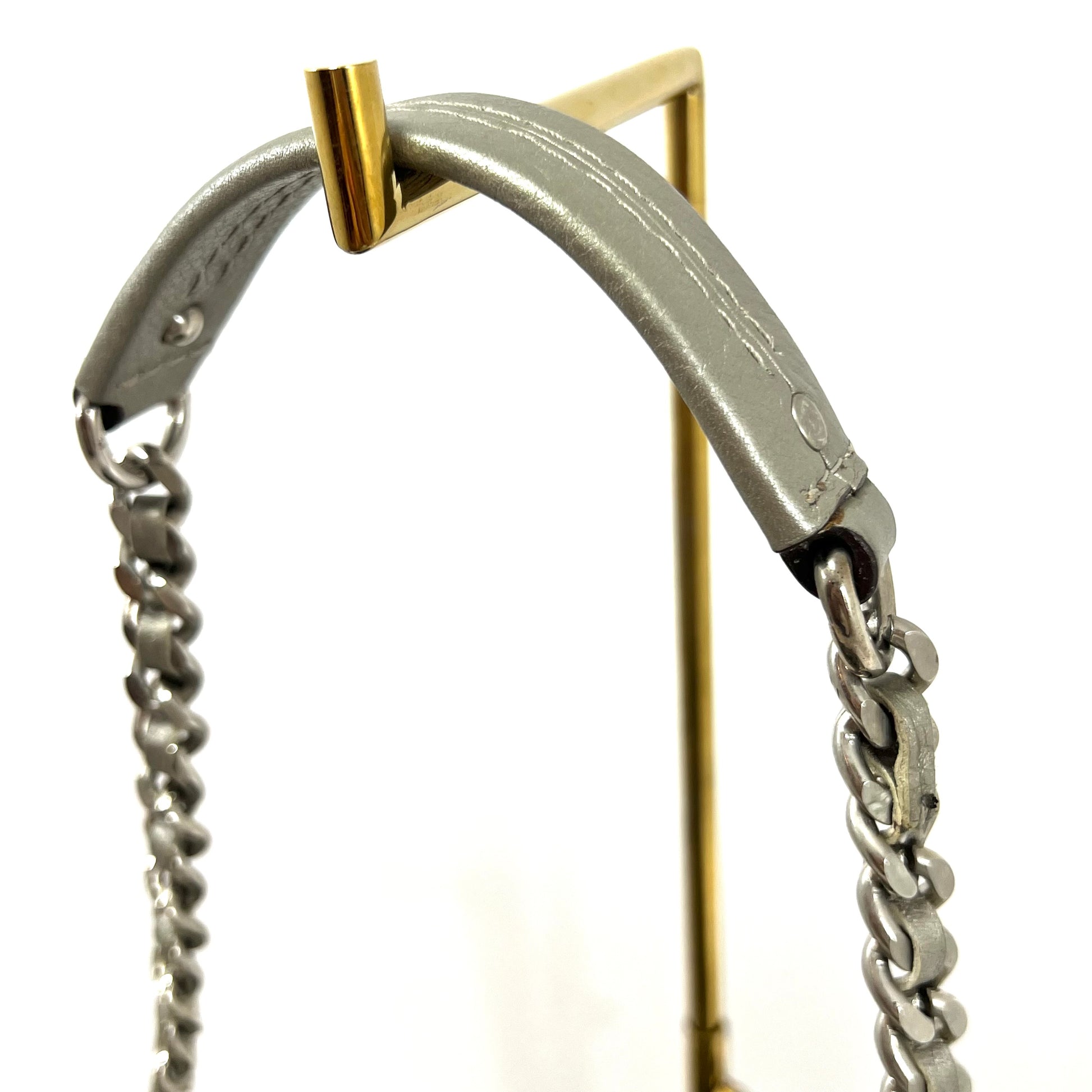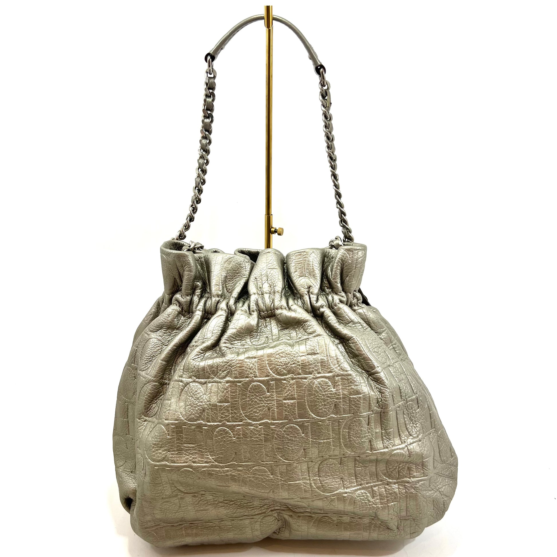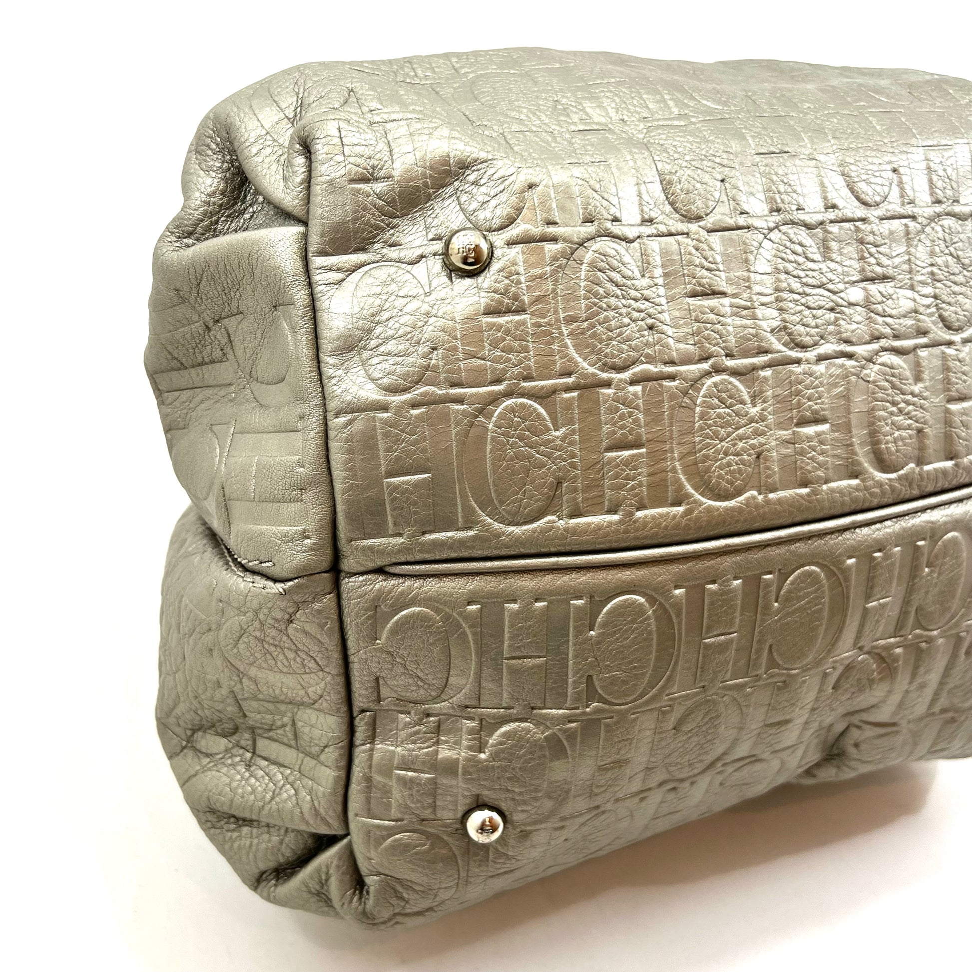 Descripción: Bolso tipo bombonera en piel en color plateado, con el monograma tatuado de iniciales de la marca con moño y cadena