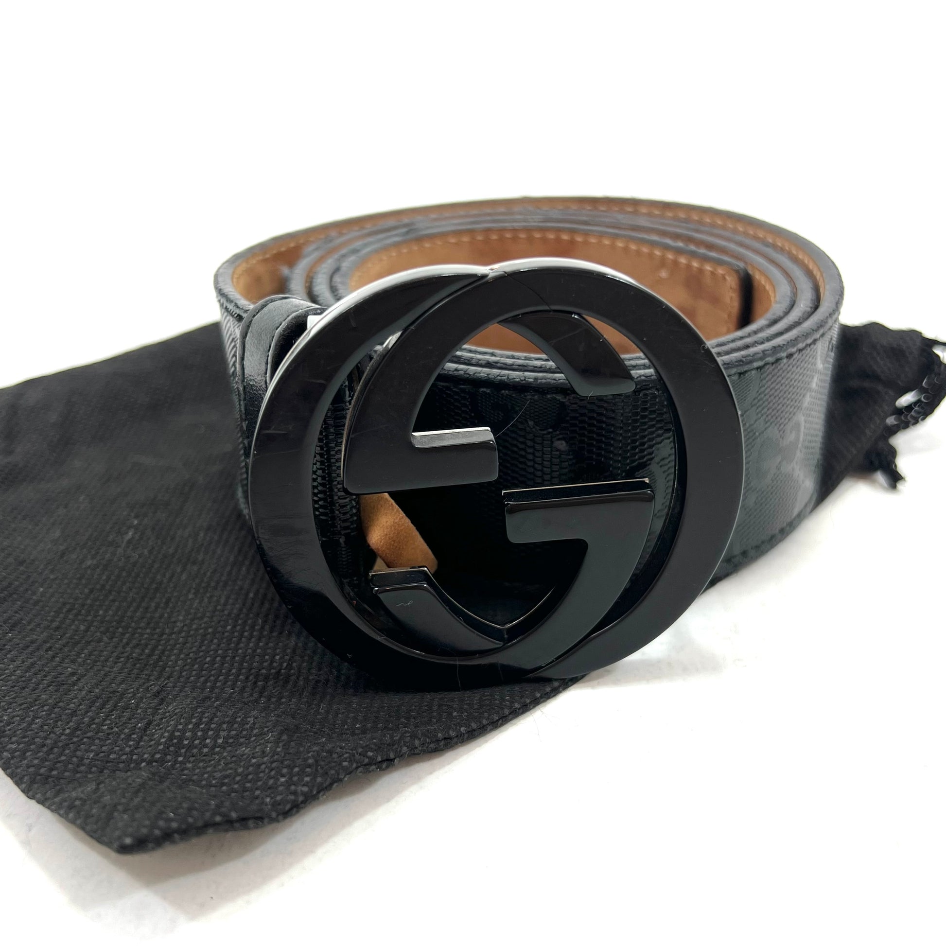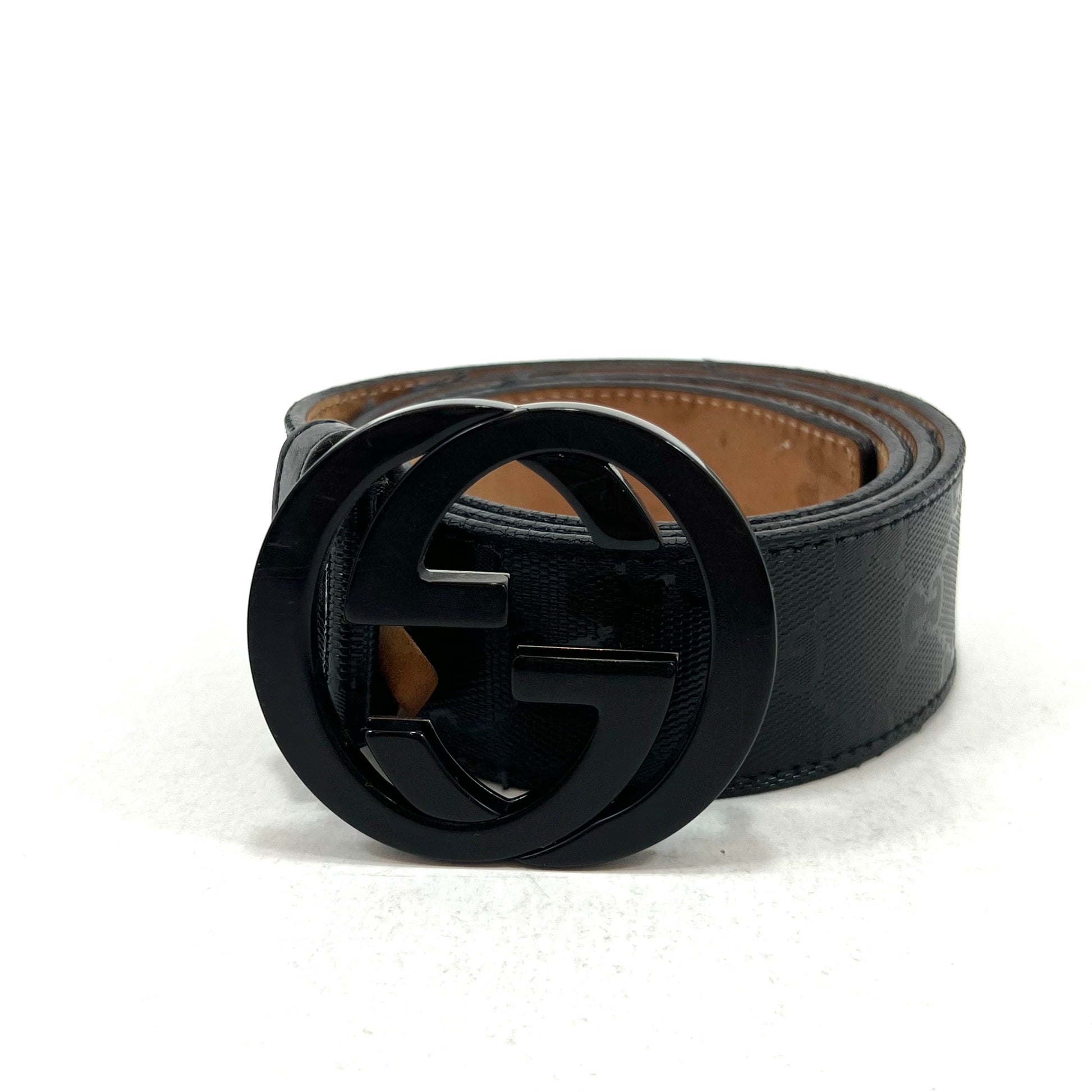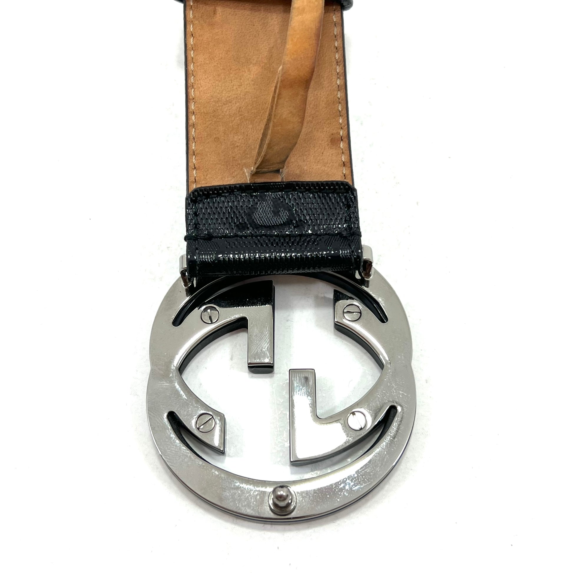 Descripción: Cinturón en piel negro, con monogram de la marca y hebilla interlocking, mono cromática