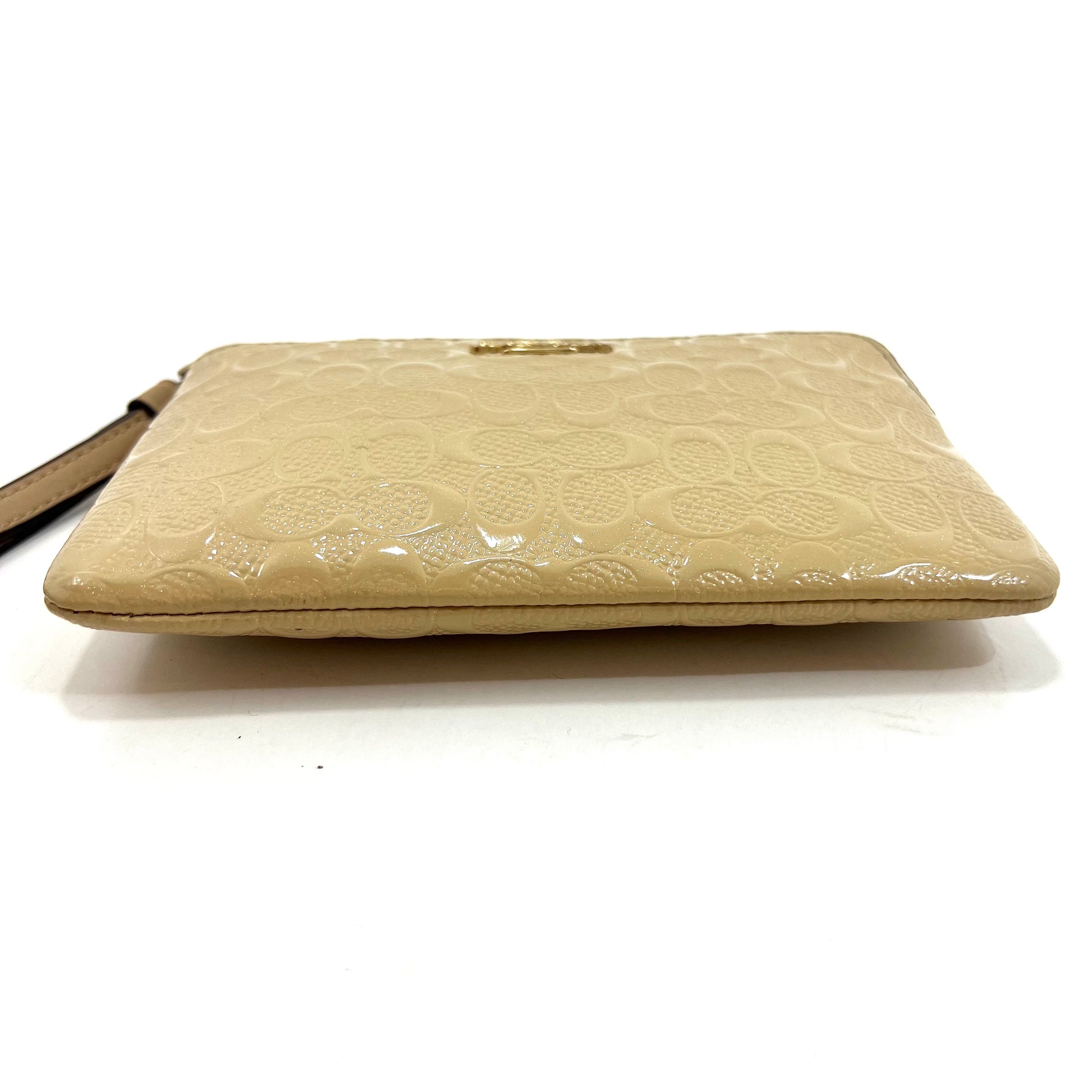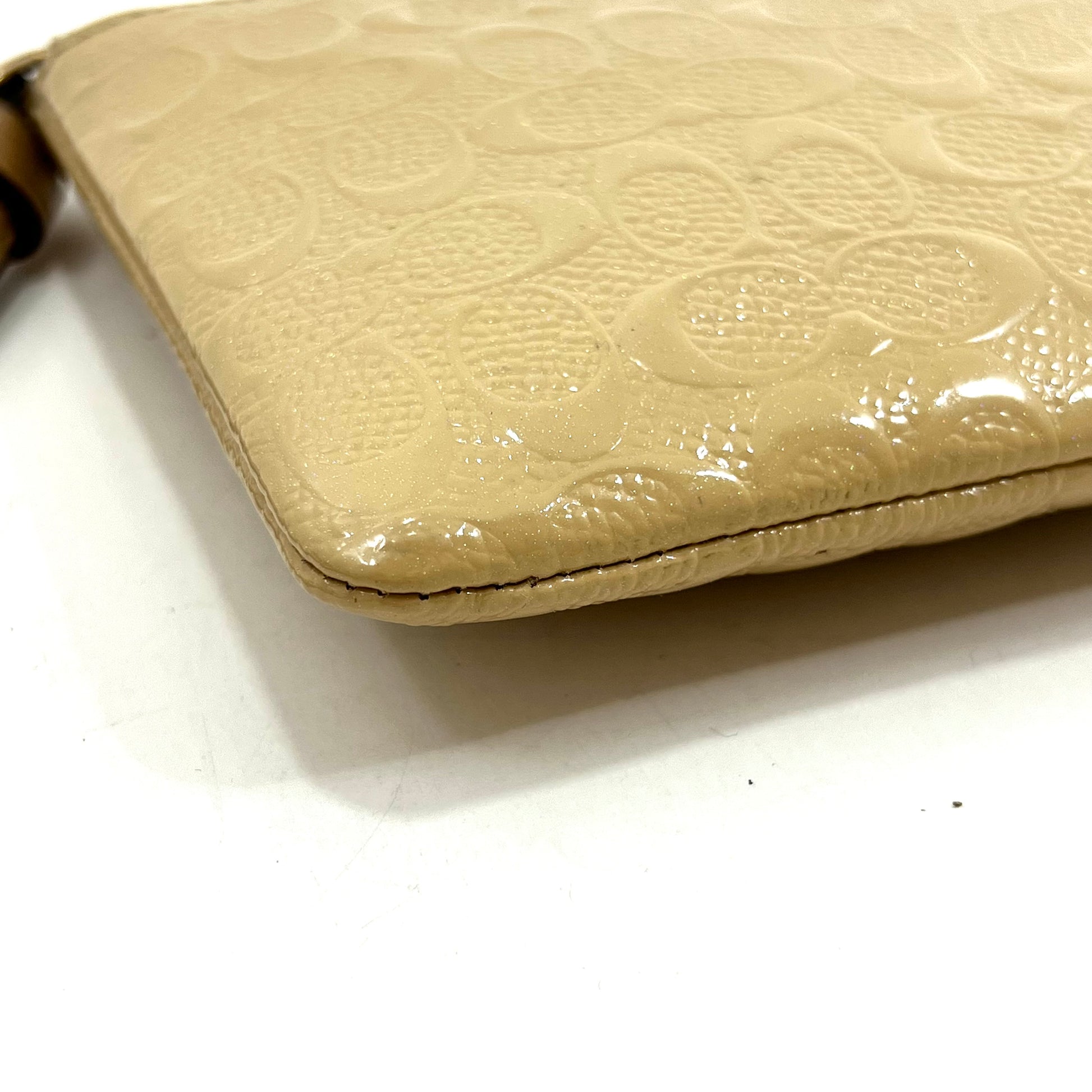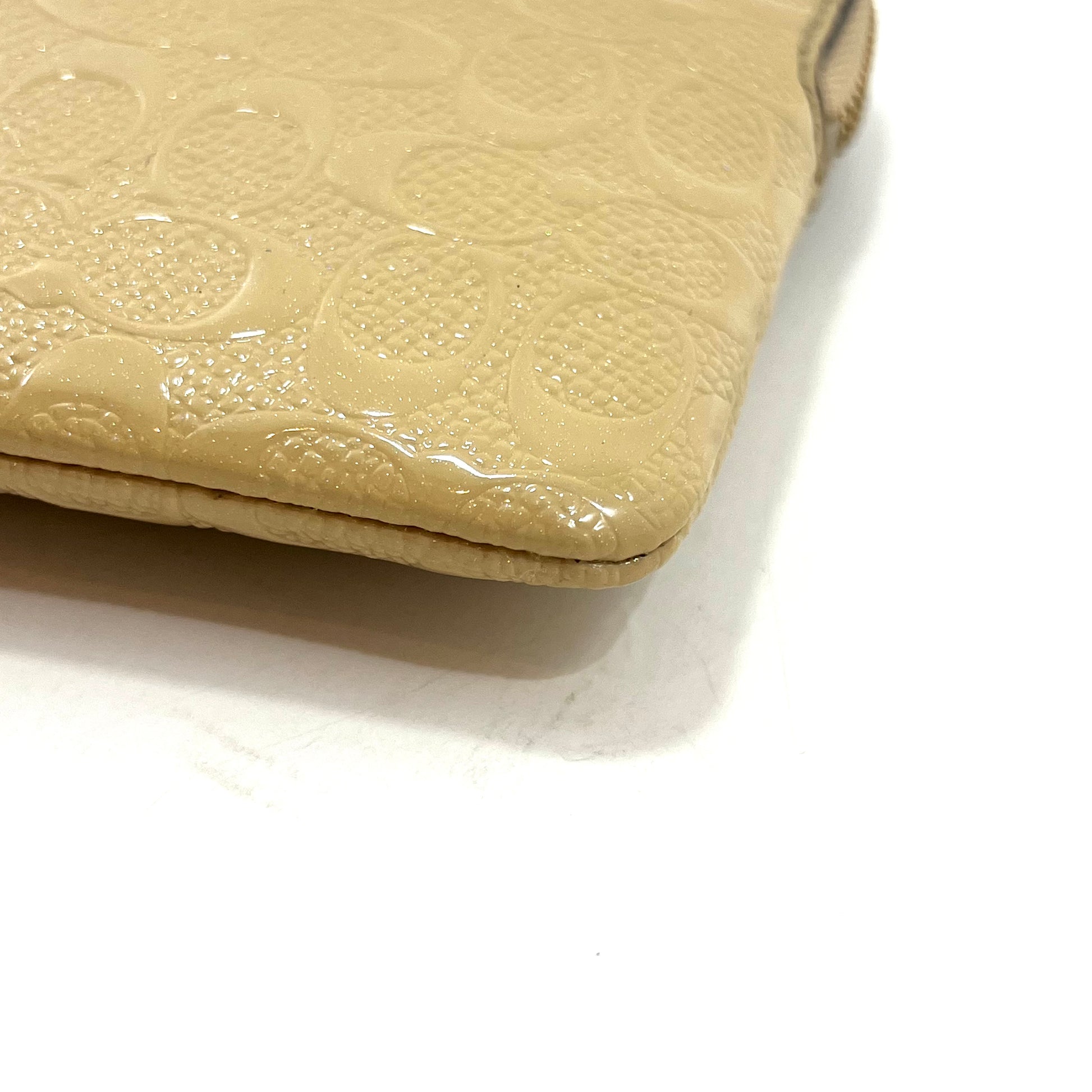 Descripción: Pochette/monedero en piel con terminado acharolado y logo de la marca tatuado color champagne