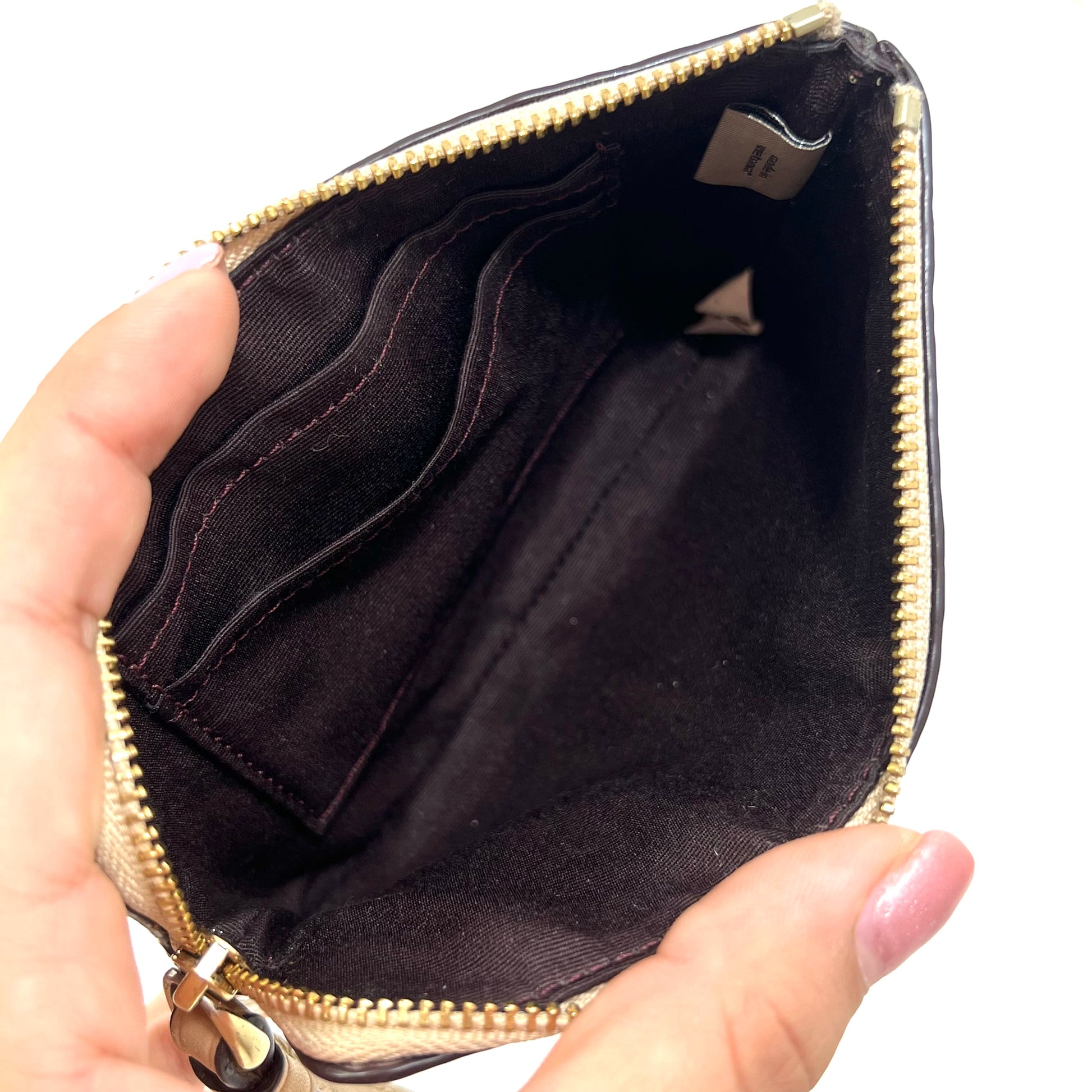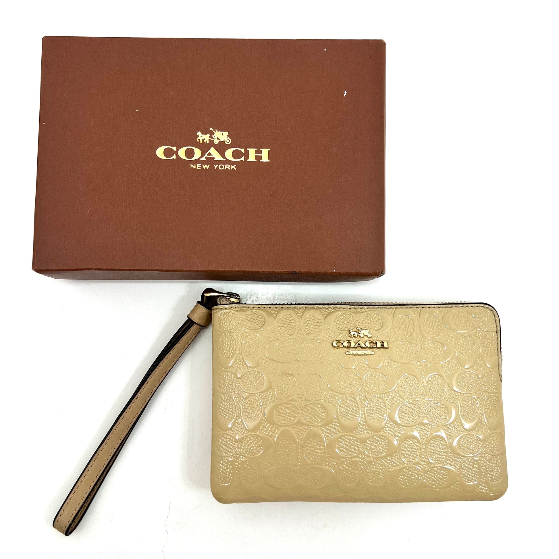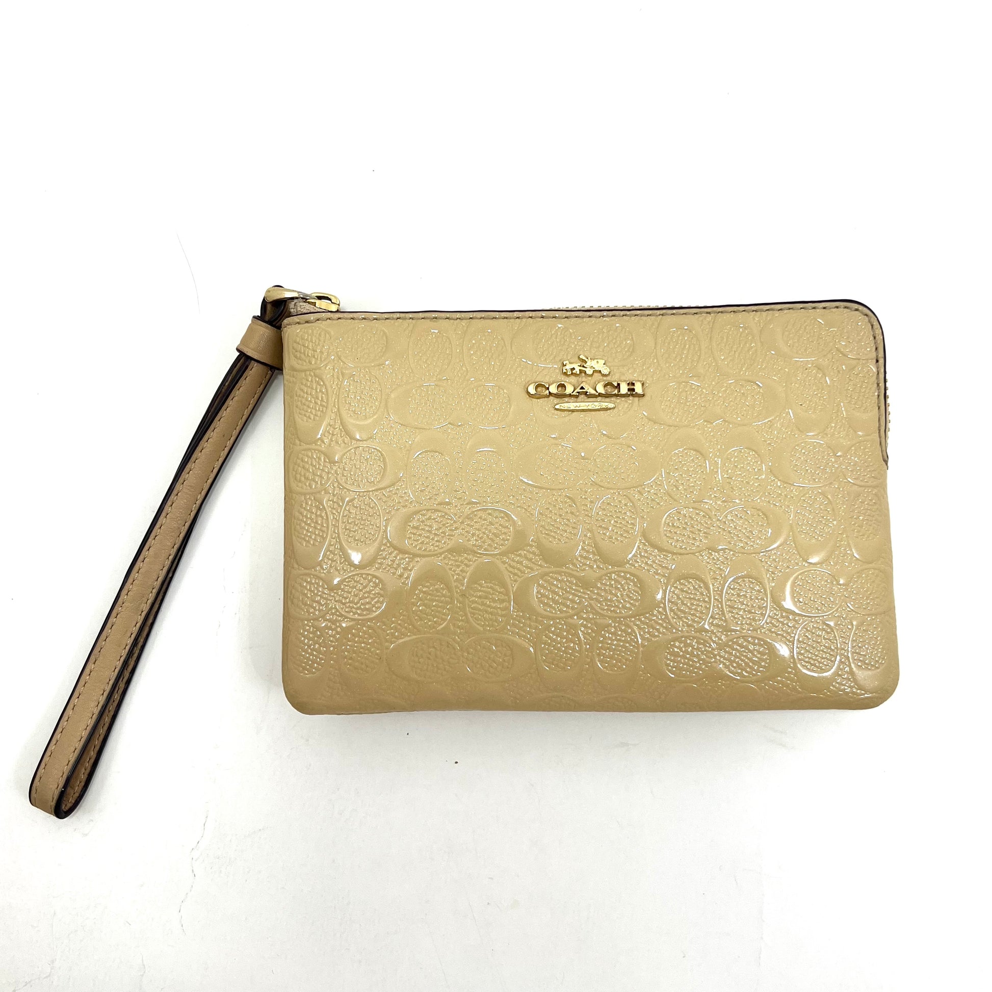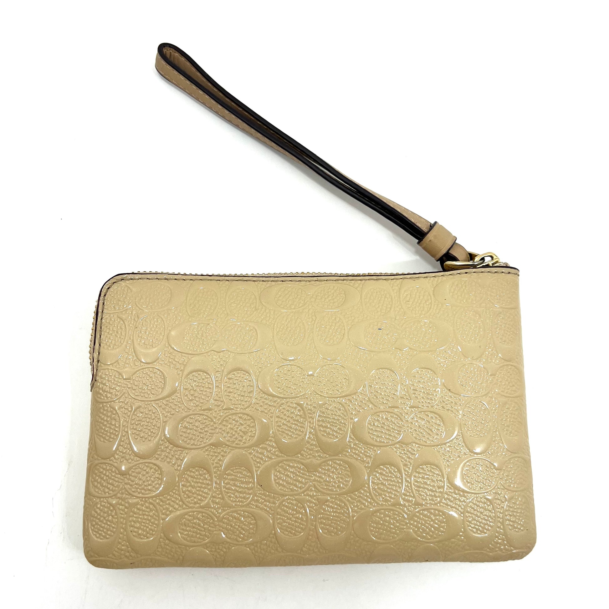 Descripción: Pochette/monedero en piel con terminado acharolado y logo de la marca tatuado color champagne