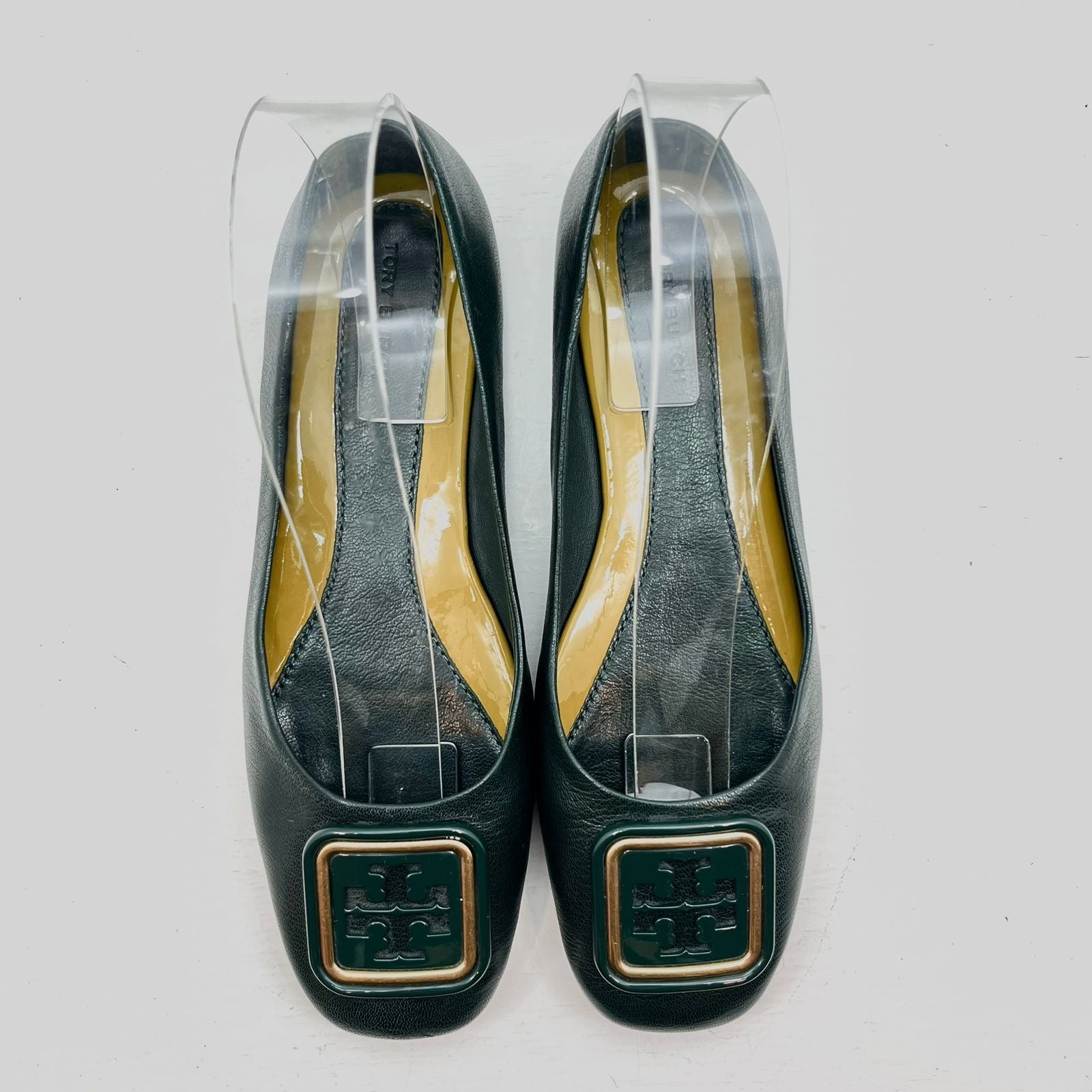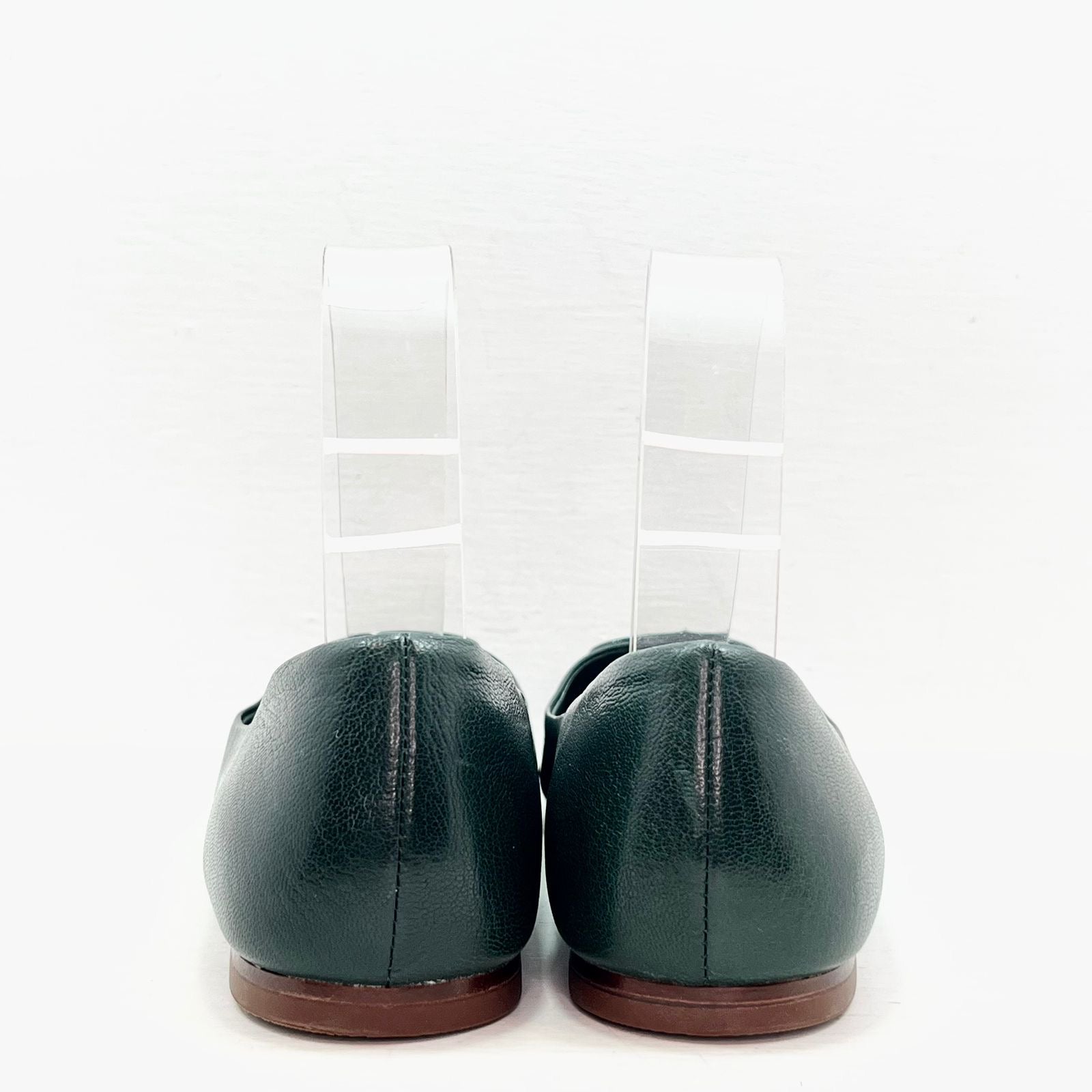 Descripción: Flats georgia en piel color verde botella con detalles en amarillo y placa con logo de la marca