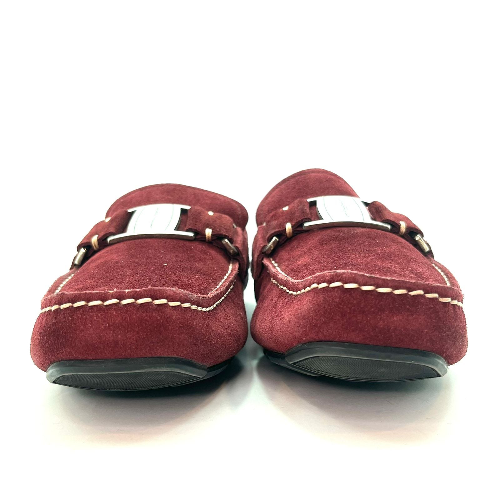 Descripción: Mocasines en suede color borgoña con placa de la marca en color plata
