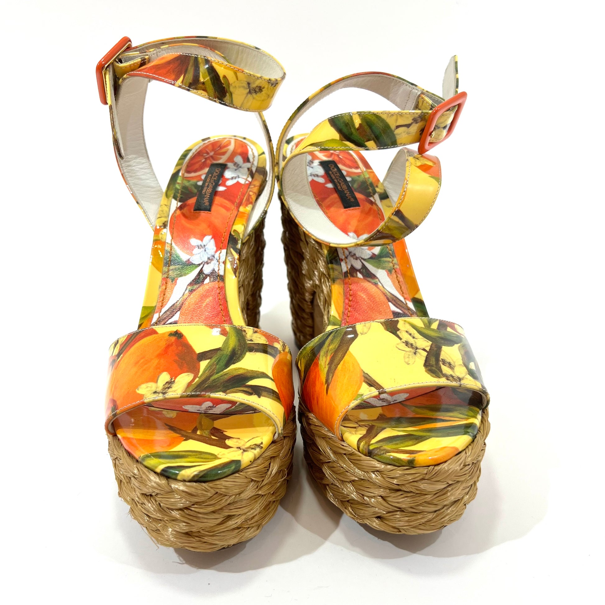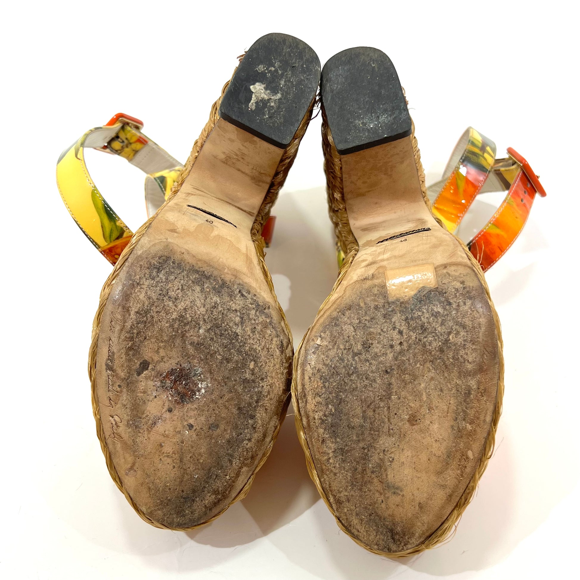 Descripción: Plataformas con estampado de naranjas y tacones de fibras naturales