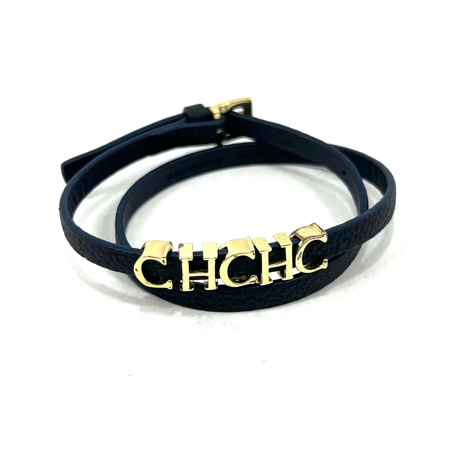 Descripción: pulsera doble en piel, color azul marino con charms de las iniciales de la marca en color dorado